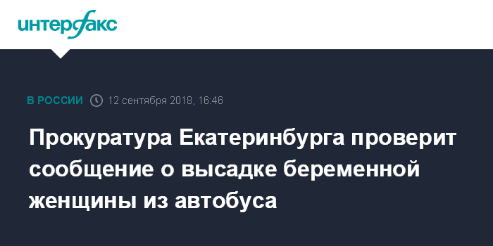 Москва. 12 сентября. INTERFAX.RU - Прокуратура Екатеринбурга проводит проверку по сообщению СМИ о высадке беременной пассажирки из автобуса из-за сделанного ею замечания водителю, сообщает пресс-служба прокуратуры Свердловской области в среду.