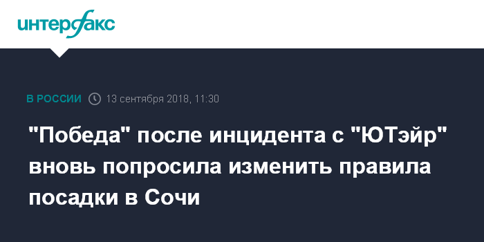 Москва. 13 сентября. INTERFAX.RU - Авиакомпания "Победа" (входит в группу "Аэрофлот" ) после инцидента с самолетом "ЮТэйр" , выкатившимся за пределы взлетной полосы, повторно направила просьбу изменить правила ухода на второй круг при посадке в аэропорту Сочи.