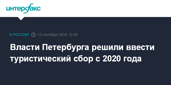 Москва. 13 сентября. INTERFAX.RU - Власти Санкт-Петербурга рассчитывают, что с 1 января 2020 года в северной столице будет введен туристический сбор в размере не более 2%, сообщил "Интерфаксу " глава городского комитета по финансам Алексей Корабельников.