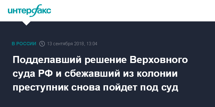 Подделавший решение Верховного суда РФ и сбежавший из колонии преступник снова пойдет под суд