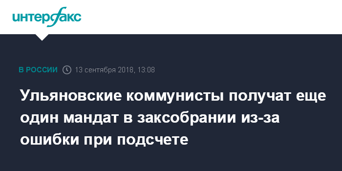 "Произошла математическая ошибка в электронной системе "ГАС Выборы" при реализации методики пропорционального распределения депутатских мандатов на выборах депутатов Законодательного собрания Ульяновской области шестого созыва. Неточность была выявлена при перепроверке результатов вручную, не был учтен так называемый "метод делителя". Согласно правильному расчету, у КПРФ должно быть восемь мандатов, а не семь", - сообщили агентству "Интерфакс" в облизбиркоме в четверг.