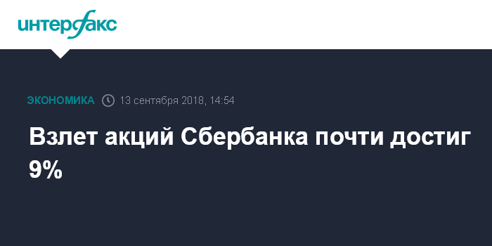 Москва. 13 сентября. INTERFAX.RU - Взлет акций Сбербанка в четверг почти достиг 9%, бумаги вернулись к уровням трехнедельной давности на фоне укрепления рубля.