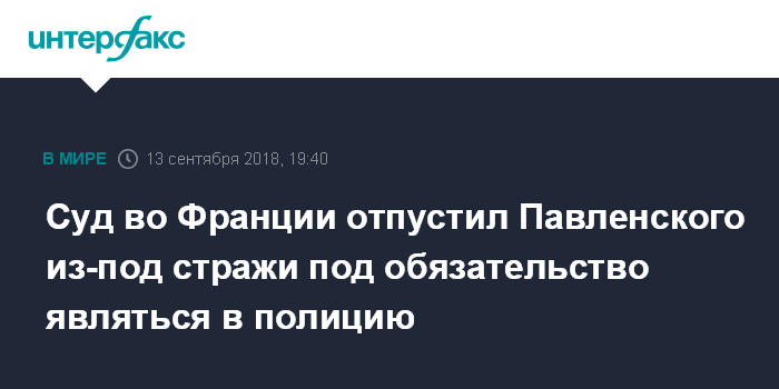 Москва. 13 сентября. INTERFAX.RU - Французский суд по итогам заседания во Дворце правосудия постановил освободить из-под стражи эмигранта из России акциониста Петра Павленского до следующих судебных слушаний, сообщает в четверг французская радиостанция Radio France Internationale.