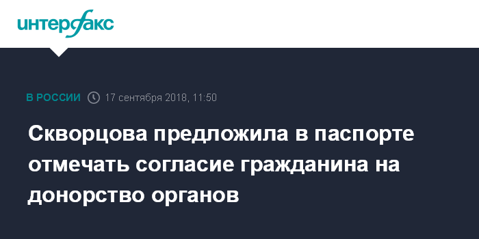 Москва. 17 сентября. INTERFAX.RU - Вопрос получения согласия человека на донорство органов в России может ставиться при получении паспорта или других официальных документов, заявила министр здравоохранения РФ Вероника Скворцова.