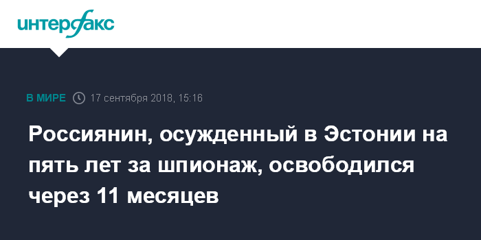 Москва. 17 сентября. INTERFAX.RU - Россиянин Михаил Петров, приговоренный в Эстонии к пяти годам заключения за шпионаж, менее чем через год оказался на свободе, утверждает газета Posrtimees.