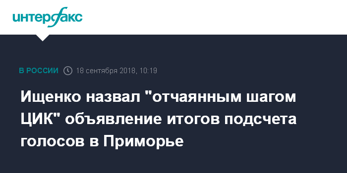 Второй тур губернаторских выборов в Приморье прошел 16 сентября. По итогам подсчета 95% голосов Ищенко выигрывал у Тарасенко (51,61% против 45,79%), однако при обработке 96,13% протоколов разрыв сократился вдвое, а по итогам подсчета 99,16% бюллетеней Тарасенко набрал 49,55% голосов против 48,06% у Ищенко. Стороны обвинили друг друга в подтасовках и фальсификациях, проводят акции протеста. ЦИК заявил, что не будет подводить итоги второго тура выборов в Приморье до рассмотрения всех жалоб.
