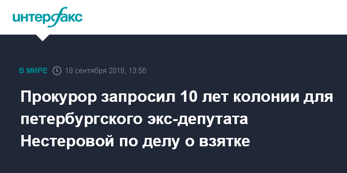 Москва. 18 сентября. INTERFAX.RU - Государственный обвинитель просит приговорить бывшего депутата Законодательного собрания Санкт-Петербурга Светлану Нестерову к 10 годам колонии по делу о взятке.