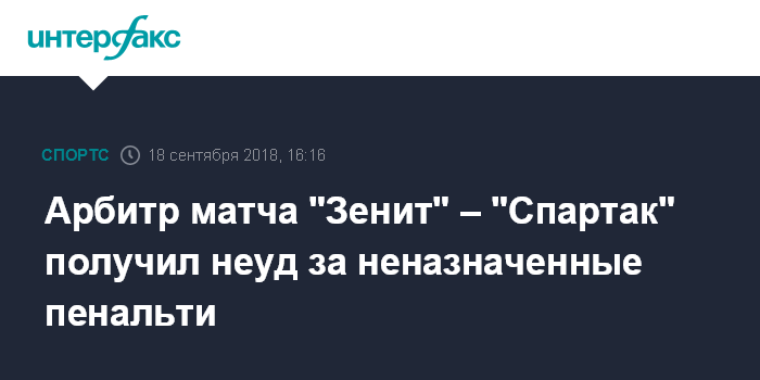 Москва. 18 сентября. INTERFAX.RU - Руководитель департамента судейства Российского футбольного союза (РФС) Александр Егоров сообщил, что арбитр Владимир Москалев получил неудовлетворительную оценку за работу на матче шестого тура чемпионата России между петербургским "Зенитом" и московским "Спартаком".