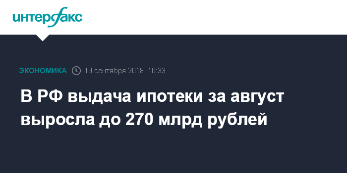 Москва. 19 сентября. INTERFAX.RU - Объем выданных ипотечных кредитов в РФ за август достиг 260-270 млрд руб, что в 1,5 раза превышает показатели августа прошлого года, подсчитали в ДОМ.РФ и FrankRG.