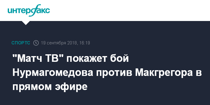 Москва. 19 сентября. INTERFAX.RU - Телеканал "Матч ТВ" будет вести прямую трансляцию боя действующего чемпиона UFC в легком весе россиянина Хабиба Нурмагомедова и бывшего чемпиона UFC в легком и в полулегком весе ирландца Конора Макгрегора.