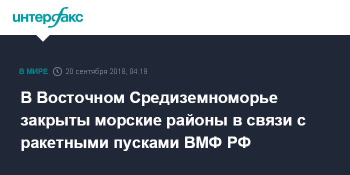 Москва. 20 сентября. INTERFAX.RU - Ряд районов в международных водах Восточного Средиземноморья вблизи Сирии, Ливана и Кипра закрыт в связи с учениями кораблей Военно-Морского флота (ВМФ) России и проведением ими "испытательных ракетных пусков", следует из международного извещения для авиационного персонала (NOTAM) и навигационного предупреждения для мореплавателей.