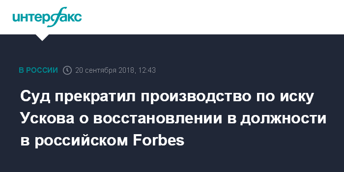 Москва. 20 сентября. INTERFAX.RU - Пресненский суд Москвы в четверг прекратил производство по иску о восстановлении в должности главного редактора российского Forbes Николая Ускова в связи с отказом последнего от своих требований.