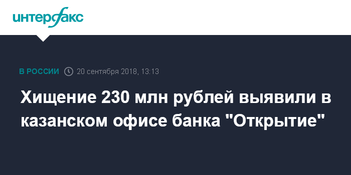 Москва. 20 сентября. INTERFAX.RU - Хищение крупной суммы денег выявлено в одном из казанских офисов банка "Открытие", в преступлении подозреваются бывшие сотрудники банка.