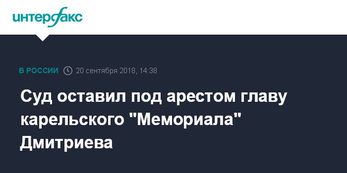 Москва. 20 сентября. INTERFAX.RU - Верховный суд Карелии в четверг оставил без изменения меру пресечения лидеру регионального правозащитного центра "Мемориал" Юрию Дмитриеву, который обвиняется в насильственных действиях сексуального характера в отношении несовершеннолетней приемной дочери.