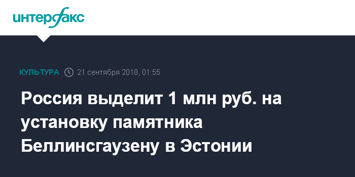 Москва. 20 сентября. INTERFAX.RU - Россия готова помочь установить в Эстонии на острове Сааремаа (Saaremaa) памятник русскому мореплавателю, адмиралу, первооткрывателю Антарктиды, по происхождению балтийскому немцу из остзейского дворянского рода Фаддею Фаддеевичу Беллинсгаузену.