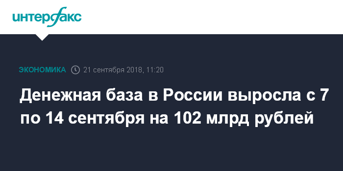 На 7 сентября денежная база в России равнялась 10359,8 млрд рублей. Таким образом, за период она выросла на 0,98%, или на 102 млрд рублей.