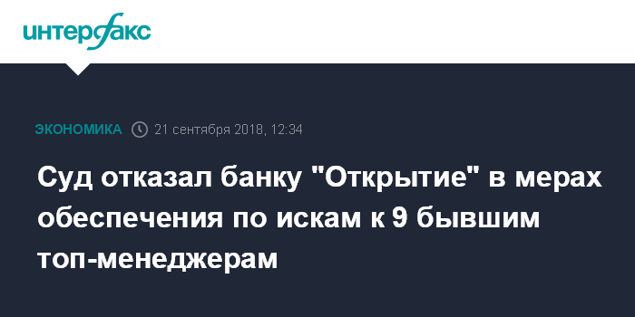 Москва. 21 сентября. INTERFAX.RU - Арбитражный суд Москвы на текущей неделе отказал санируемому банку "Открытие" в принятии мер обеспечения по искам к девяти бывшим топ-менеджерам, следует из картотеки суда.