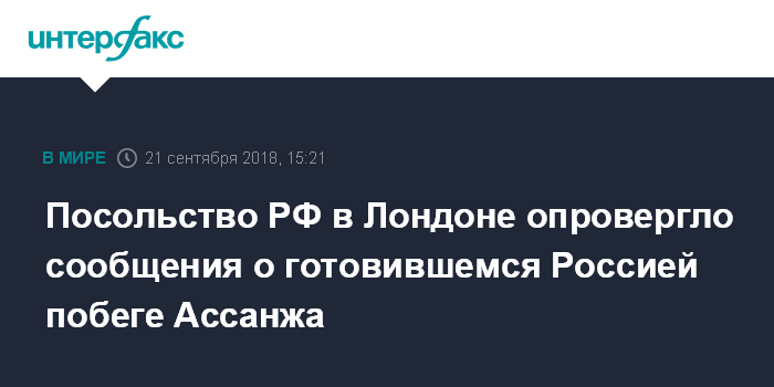 Москва. 21 сентября. INTERFAX.RU - Посольство России в Лондоне опровергло сообщения британской газеты The Guardian о том, что РФ якобы вынашивала секретный план оказания основателю Wikileaks Джулиану Ассанжу помощи в бегстве из Великобритании.