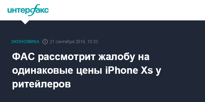Москва. 21 сентября. INTERFAX.RU - Федеральная антимонопольная служба (ФАС) РФ проанализирует поступившую регулятору жалобу на возможный сговор при установлении цен на флагманский телефон Apple iPhone Xs в рознице, предзаказ которого стартовал в России 21 сентября.