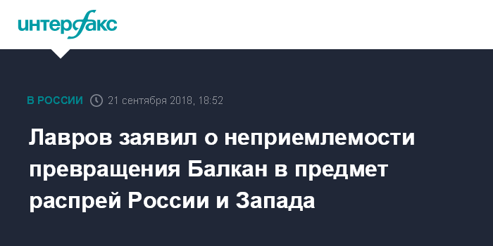 Москва. 21 сентября. INTERFAX.RU - Балканы не должны становиться предметом распрей между Россией и странами Запада, заявил глава МИД РФ Сергей Лавров.