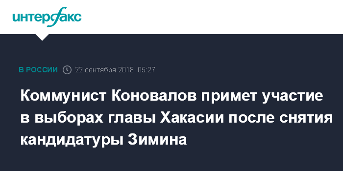 9 сентября в Хакасии состоялись выборы главы региона. За пост боролись четыре кандидата: действующий глава региона, кандидат от "Единой России" Виктор Зимин, лидер регионального отделения партии "Справедливая Россия" Андрей Филягин, первый секретарь регионального отделения КПРФ Валентин Коновалов, а также директор ООО "Современные технологии" Александр Мяхар от регионального отделения "Партии роста".