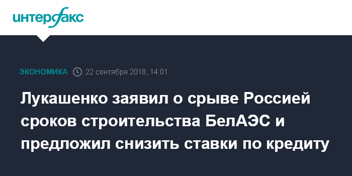 Москва. 22 сентября. INTERFAX.RU - Президент Белоруссии Александр Лукашенко на белорусско-российских переговорах в Сочи 21 сентября заявил, что в связи со срывом срока строительства БелАЭС по вине российской стороны Минск рассчитывает на снижение ставки по кредиту.