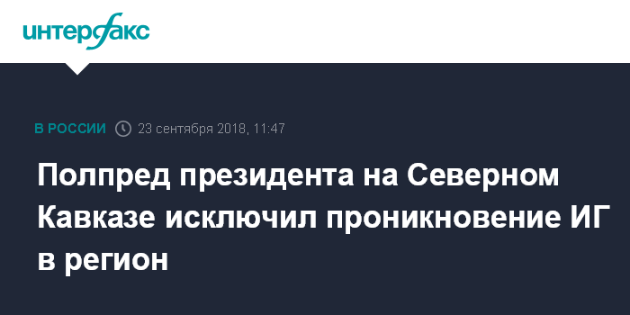 Москва. 23 сентября. INTERFAX.RU - Северный Кавказ в настоящий момент является мирным регионом, угроза проникновения террористов запрещенной в России группировки "Исламское Государство" (ИГИЛ, ИГ) отсутствует, заявил полпред президента РФ в Северо-Кавказском федеральном округе (СКФО) Александр Матовников.