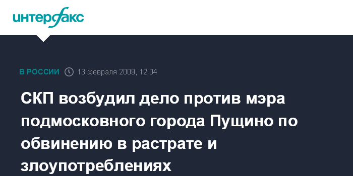 Москва. 13 февраля. INTERFAX.RU - В отношении мэра подмосковного города Пущино возбуждено уголовное дело.