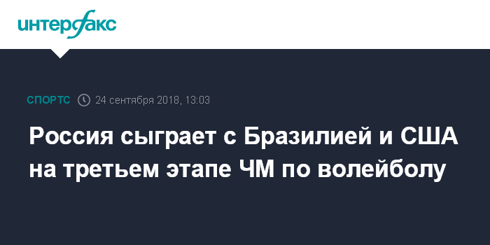 Москва. 24 сентября. INTERFAX.RU - Сборные Бразилии и США по волейболу стали соперниками национальной команды России по третьему групповому этапу чемпионата мира среди мужчин.