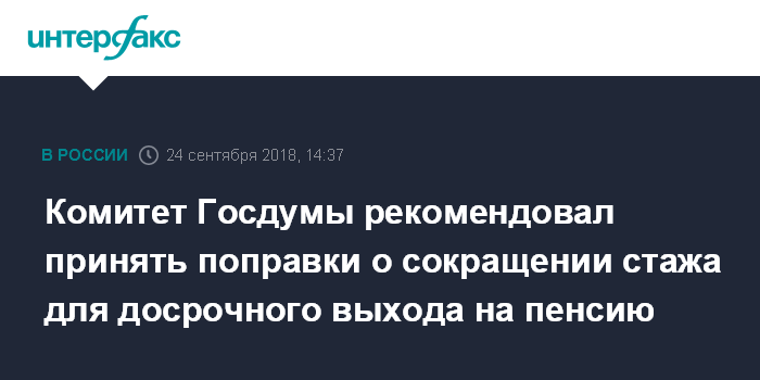 Москва. 24 сентября. INTERFAX.RU - Комитет Госдумы по труду, социальной политике и делам ветеранов на заседании в понедельник рекомендовал принять поправки группы депутатов от "Единой России" к законопроекту об изменении пенсионной системы, в том числе о сокращении стажа, необходимого для досрочного выхода на пенсию, говорится в сообщении пресс-службы фракции "Единая Россия".