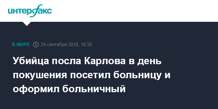 Москва. 24 сентября. INTERFAX.RU - Стрелявший в российского посла в Турции Андрея Карлова Мевлют Мерт Алтынташ в день убийства посетил больницу, где оформил официальный больничный. Об этом сообщила в понедельник газета Hurriyet со ссылкой на имеющиеся в ее распоряжении данные по расследованию.