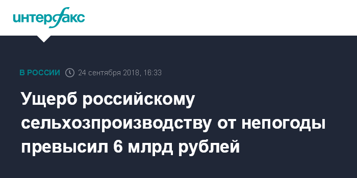 "В целом 22-23 региона пострадали от чрезвычайных ситуаций, на сегодняшний день ущерб посчитан по 18 регионам, - сказал он. - Думаю, что порядка 6 млрд рублей, может, 6 с небольшим млрд рублей - это тот ущерб, который нанесли чрезвычайные ситуации сельхозпроизводителям".