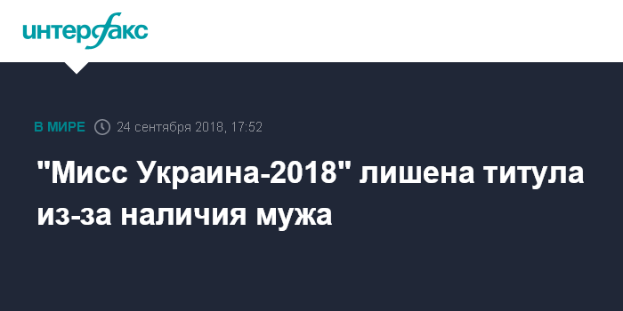 Москва. 24 сентября. INTERFAX.RU - Победительница конкурса красоты "Мисс Украина - 2018" Вероника Дидусенко дисквалифицирована и лишена звания за предоставление недостоверной информации о своем семейном положении и отсутствии детей, сообщает оргкомитет конкурса.