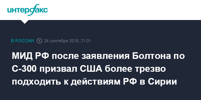 МИД РФ после заявления Болтона по С-300 призвал США более трезво подходить к действиям РФ в Сирии