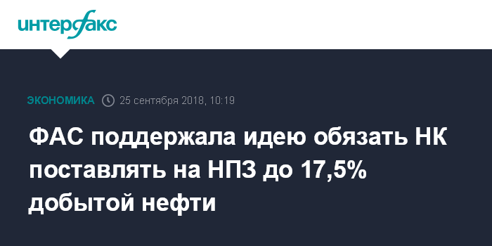 Москва. 25 сентября. INTERFAX.RU - Федеральная антимонопольная служба (ФАС) поддерживает идею на законодательном уровне обязать нефтяные компании поставлять на российские НПЗ 17,5% добытой нефти, сообщил в интервью газете "Коммерсантъ" глава ведомства Игорь Артемьев.
