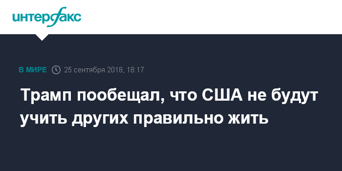 Москва. 25 сентября. INTERFAX.RU - Президент США Дональд Трамп заявил с трибуны Генассамблеи ООН, что Вашингтон не собирается учить другие страны, как правильно себя вести.