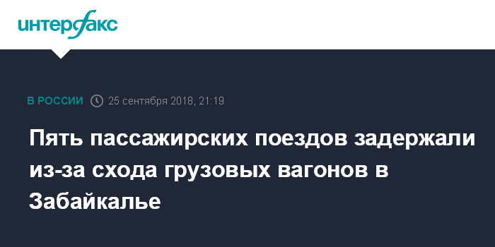 Москва. 25 сентября. INTERFAX.RU - Сход вагонов грузового поезда на перегоне Куэнга - Приисковая Забайкальской железной дороги стал причиной задержки нескольких пассажирских составов, сообщает пресс-служба ЗабЖД.