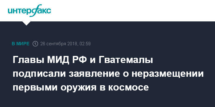 В нем отмечается, что по "итогам встречи министры подписали Совместное заявление Российской Федерации и Республики Гватемала о неразмещении первыми оружия в космосе".