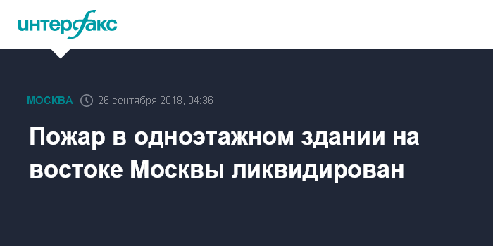 Москва. 26 сентября. INTERFAX.RU - Пожарные ликвидировали возгорание в одноэтажном металлическом здании на востоке Москвы, сообщает столичное ГУ МЧС России.