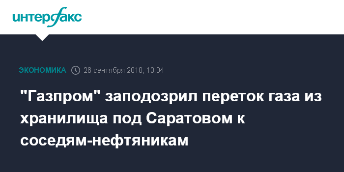 Москва. 26 сентября. INTERFAX.RU - "Газпром" подозревает, что его газ, хранящийся в крупном подземном хранилище в Саратовской области, утекает к работающему по соседству независимому недропользователю, который в процессе добычи нефти просто сжигает "голубое топливо".