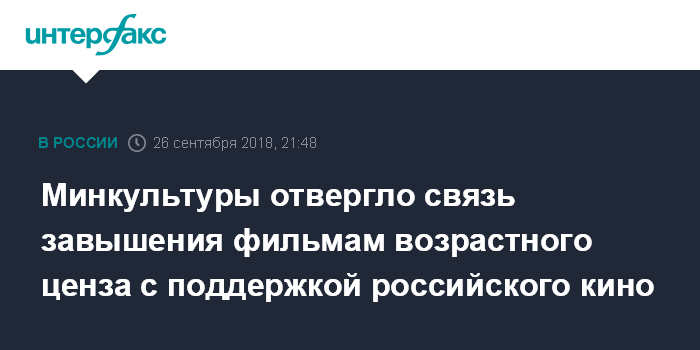 Москва. 26 сентября. INTERFAX.RU - В Минкультуры РФ заявили, что при определении возрастного рейтинга фильмов министерство руководствуется законом, а не какими бы то ни было "внутренними или внешними командами".