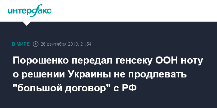 Москва. 26 сентября. INTERFAX.RU - Президент Украины Петр Порошенко передал генеральному секретарю ООН Антониу Гутерришу ноту о решении Киева не продлевать действие Договора о дружбе, сотрудничестве и партнерстве с Россией. Об этом сообщает пресс-секретарь главы государства Святослав Цеголко.