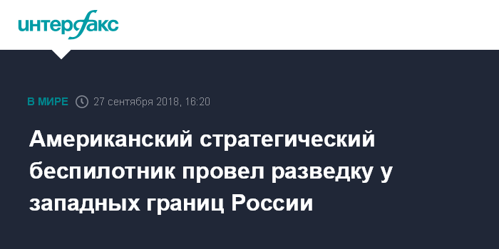 Москва. 27 сентября. INTERFAX.RU - Стратегический беспилотный летательный аппарат ВВС США RQ-4A Global Hawk в четверг в течение нескольких часов вел разведку вблизи российских рубежей на Балтике, следует из мониторинговых данных западных авиационных ресурсов.
