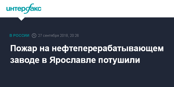 Москва. 27 сентября. INTERFAX.RU - В Ярославле ликвидировано возгорание на нефтеперерабатывающем заводе. Об этом сообщили "Интерфаксу" в пресс-службе "Славнефть-ЯНОС".