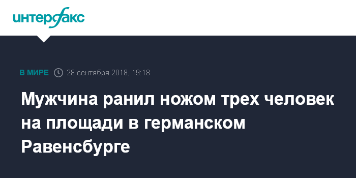 Москва. 28 сентября. INTERFAX.RU - По меньшей мере три человека получили ножевые ранения в результате нападения мужчины в немецком городе Равенсбург (федеральная земля Баден-Вюртемберг), сообщает в пятницу онлайн-портал немецкого журнала Focus со ссылкой на местную полицию.