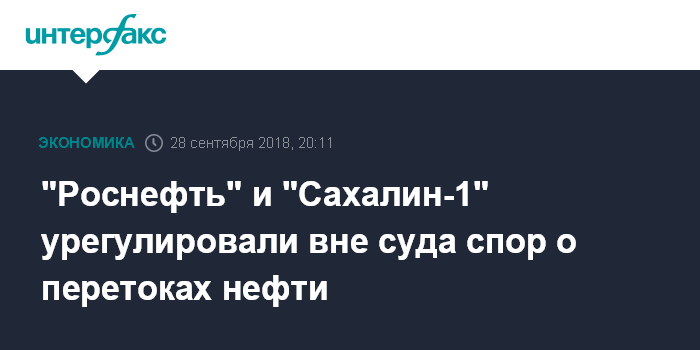 Москва. 28 сентября. INTERFAX.RU - "Роснефть" и консорциум "Сахалин-1" договорились о внесудебном урегулировании спора по вопросу перетоков нефти с северной оконечности Чайво на основную часть месторождения. Об этом сообщает агентство Reuters со ссылкой на топ-менеджера компании ONGC Videsh.