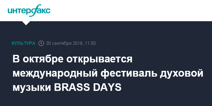 Москва. 30 сентября. INTERFAX.RU - Международный фестиваль BRASS DAYS, впервые состоявшийся в 2011 году, пройдет в этом году в Москве, Туле, Волгограде и Оренбурге. Он был учрежден для того, чтобы повысить интерес публики к духовому инструментальному искусству.