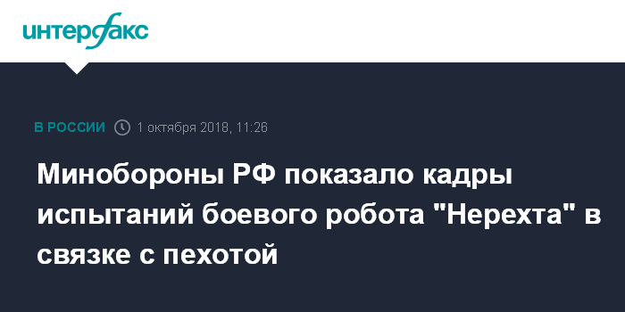 Москва. 1 октября. INTERFAX.RU - Министерство обороны РФ показало кадры применения боевого робота "Нерехта" в связке с пехотой.
