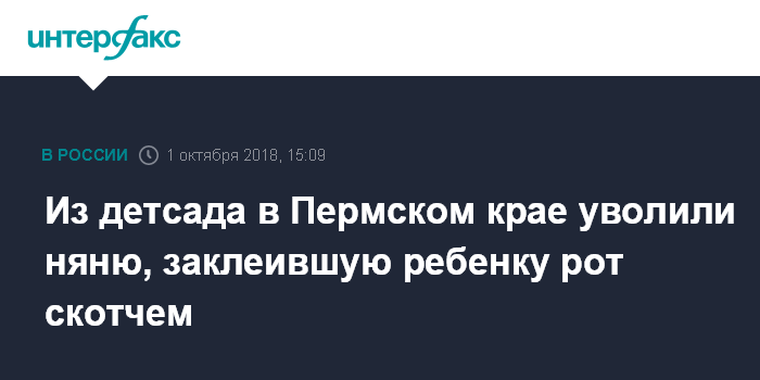 Москва. 1 октября. INTERFAX.RU - Руководство детского сада в Березниках (Пермский край) уволило няню, которая, чтобы утихомирить воспитанника, заклеила ему рот скотчем, сообщили агентству "Интерфакс" в пресс-службе краевого министерства образования в понедельник.