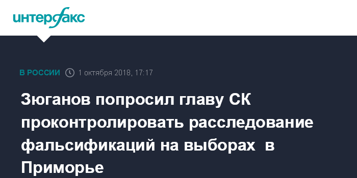 Зюганов направил главе СК письмо, в котором просит "с учетом большого общественного резонанса взять на ваш контроль принятие решений (...) по информации о нарушениях избирательного законодательства в Приморском крае".